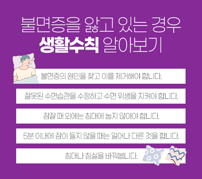 또 잠을 잘 때 외에는 침대에 눕지 않도록 해야 합니다. 평소 침대에 눕는 것이 습관화되어 있다면 막상 수면을 취하려 할 때 잠이 오지 않을 수 있습니다. 그리고 5분 이내에 잠이 들지 않는다면 일어나서 다른 것을 하는 것이 좋습니다. 또 침대나 침실을 바꿔보는 것도 방법이 될 수 있습니다.