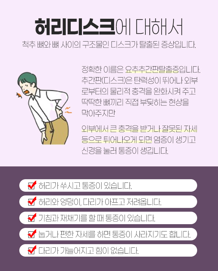 그러나 외부에서 크게 충격을 받거나 잘못된 자세 등으로 인해 튀어나오게 되면 염증이 발생하면서 신경을 눌러 통증이 생기게 되는데요. 또 허리 디스크를 앓게 되면 다음과 같은 증상이 발생합니다.