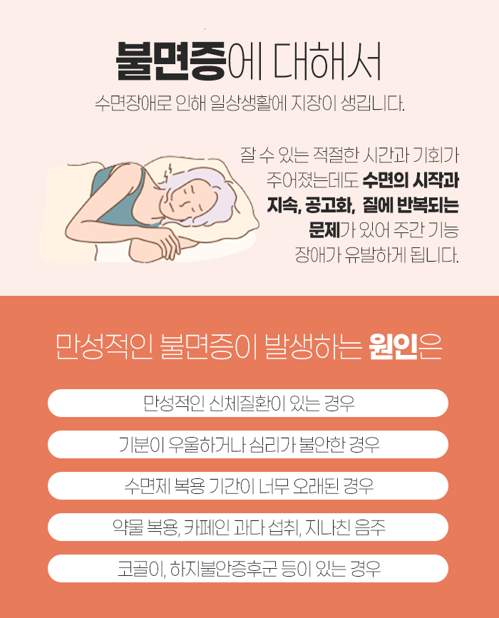그리고 이렇게 만성적인 불면증이 발생하게 되는 이유는 만성적인 신체 질환을 앓고 있거나 있거나 우울해서 또는 심리가 불안해서입니다. 또 수면제를 복용한 기간이 너무 오래되었거나 약물을 복용해서, 카페인을 과다 섭취해서 잠이 오지 않기도 하는데요. 지나치게 음주를 하거나 코골이, 하지불안 증후군 등이 있는 경우에도 불면증이 발생합니다.