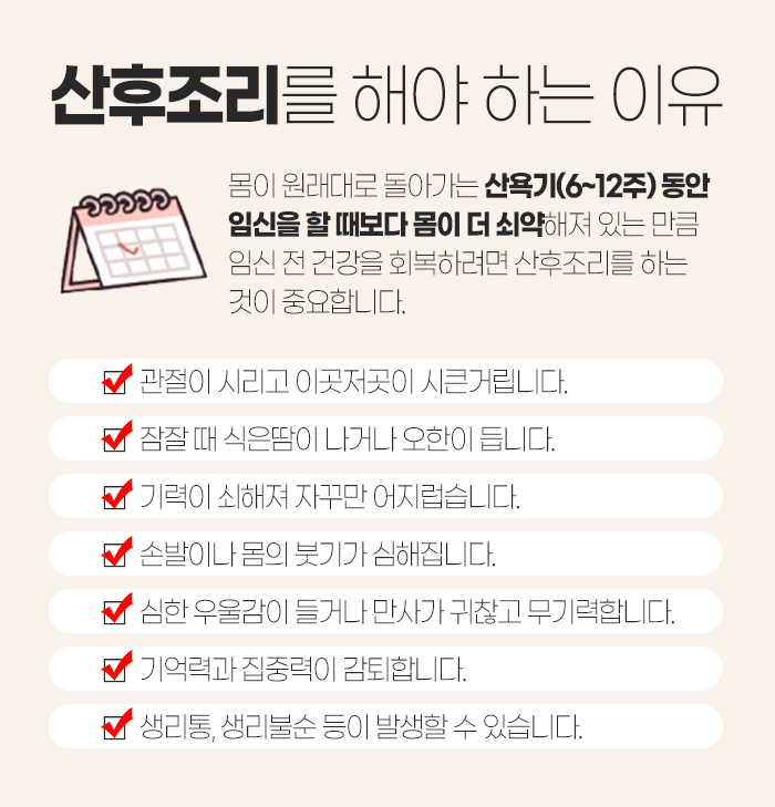 그리고 출산을 할 때 어혈도 발생하게 되는데요. 여기서 어혈이란 미세혈관이 파열되면서 혈액이 발생하게 되는 것을 말합니다. 이 혈액이 몸에 흡수되지 못한 채 조직이나 피부에 몰려 있게 되면서 혈액순환 장애를 일으키게 되는데요. 그래서 두통과 어지러움, 이명, 소화불량, 자율신경 이상, 전신 피로감 등의 증상을 야기하게 된답니다.
