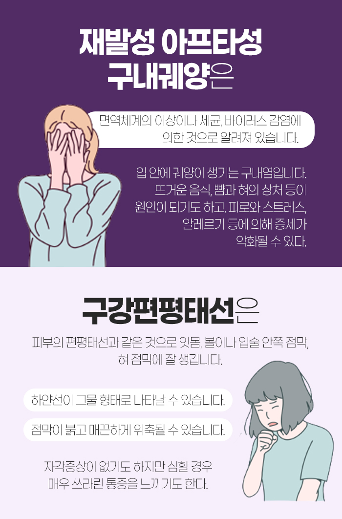 그리고 재발성 아프타성 구내궤양의 경우 면역체계의 이상이나 세균, 바이러스 감염에 의해서 나타나는 것으로 알려져 있으며, 입안에 궤양이 생깁니다. 뜨거운 음식을 섭취하거나 뺨과 혀의 상처 등이 원인이 되어 나타나는데요. 너무 피로하거나 스트레스를 많이 받은 경우, 알레르기에 의해서도 증상이 악화될 수 있답니다.