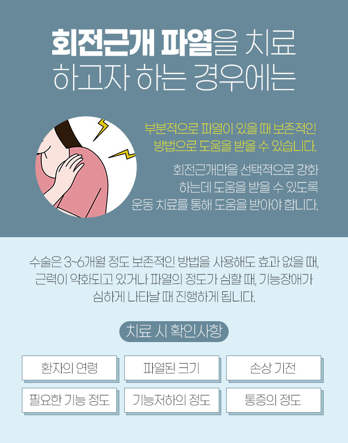 또 회전근개 치료를 진행하게 될 때 수술, 비수술 여부를 가르게 되는 것은 바로 환자분의 연령과 파열된 크기, 손상 기전, 필요한 기능 정도, 기능 저하의 정도, 통증의 정도랍니다. 또 수술을 받아야 되는 상황이어서 수술을 받았으나 다시 어깨의 움직임을 원래대로 회복하기 위해 치료를 하는데 도움을 받고자 원주일요일한의원을 찾게 되시기도 한답니다.