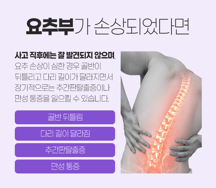덧붙여 사고로 요추부가 손상된 경우에는 사고 직후 잘 발견되지 않는데요. 시간이 지나 뒤늦게 나타나게 되는 경우가 많답니다. 이렇게 요추부가 손상되면 골반이 뒤틀리게 되거나 다리 길이가 달라지는 문제가 발생하게 됩니다. 또 장기적으로 추간판 탈출증이 발생하거나 만성적인 통증이 발생할 수 있습니다.
