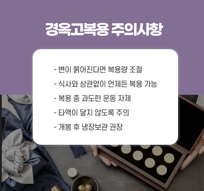 또한 수험생, 직장인, 고령자, 산후 회복기 여성, 수술 후 회복 중인 환자들에게도 널리 권장되고 있으며, 특히 기력이 약해 밥맛이 없고 쉽게 지치는 사람들이 경옥고를 복용하면 식욕이 회복되고 전반적인 컨디션이 향상되는 경험을 하게 됩니다. 경옥고는 단순히 피곤할 때 먹는 보조제가 아닌, 몸의 깊은 곳부터 원기를 보하고 회복력을 길러주는 전통 한방 처방으로, 꾸준한 복용을 통해 삶의 질을 향상시켜주는 데 도움을 줄 수 있는 지혜로운 약입니다. 오늘날처럼 피로와 스트레스가 일상이 된 현대사회에서 경옥고는 육체뿐 아니라 마음까지 돌보는 데 큰 역할을 할 수 있습니다.