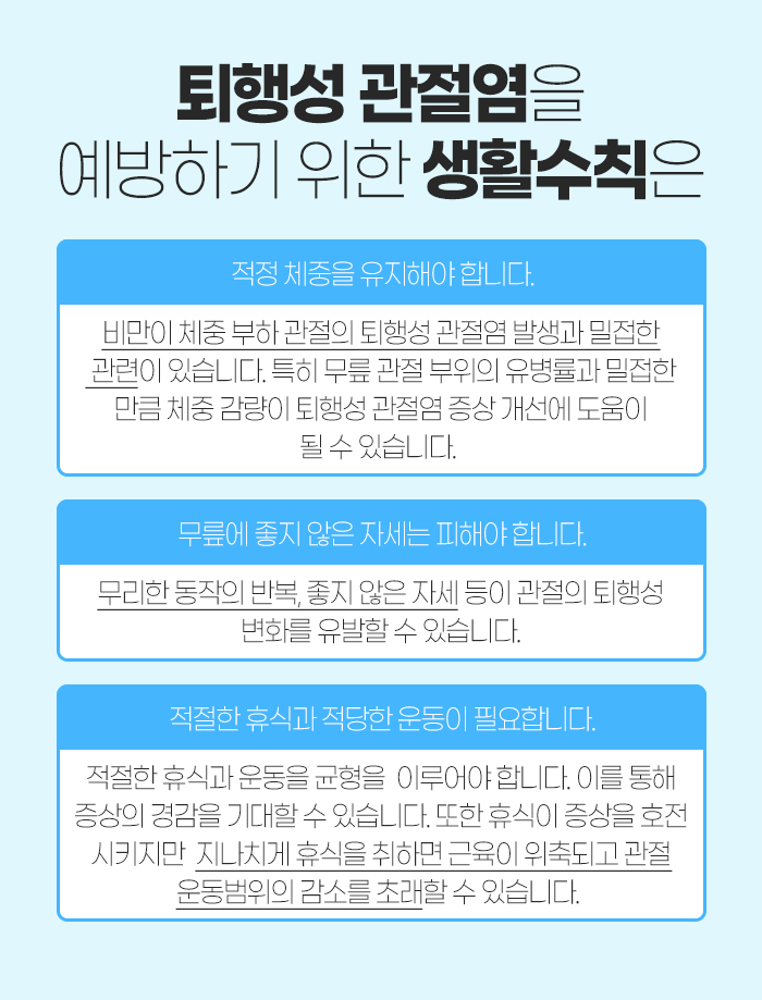 그리고 퇴행성 관절염이 발생했을 때 무실동공휴일한의원 등에서 도움을 받는 것도 좋지만 생활습관을 잘 관리하도록 해야 합니다. 우선 적정 체중을 유지하도록 해야 하는데요. 비만이 되면 체중 부하로 인해 관절에 악영향을 끼치게 됩니다. 이는 무릎 관절 부위의 유병률과 밀접하게 관련이 있는데요. 그래서 체중을 감량하는 것이 도움이 된답니다.