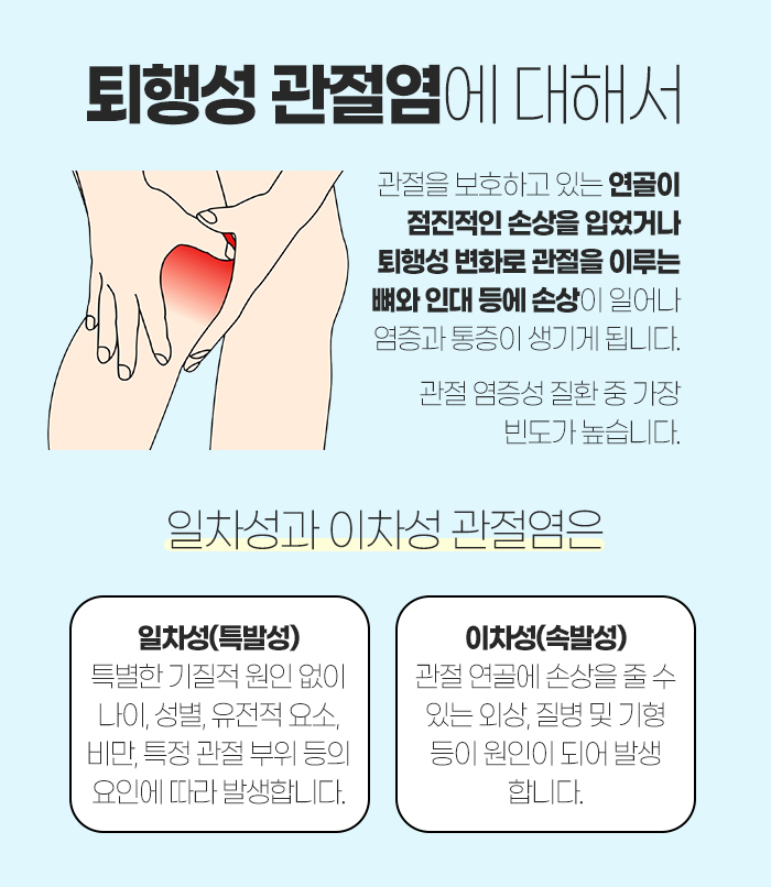 그리고 퇴행성 관절염은 일차성과 이차성이 있습니다. 일차성은 특별한 기질적 원인 없이 나이나 성별, 유전적인 요소, 비만, 특정 관절 부위 등에 의해 나타나게 됩니다. 다음으로 이차성은 관절 연골에 손상을 줄 수 있는 외상이나 질병, 기형 등이 원인이 되어 나타나게 됩니다.