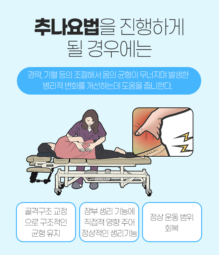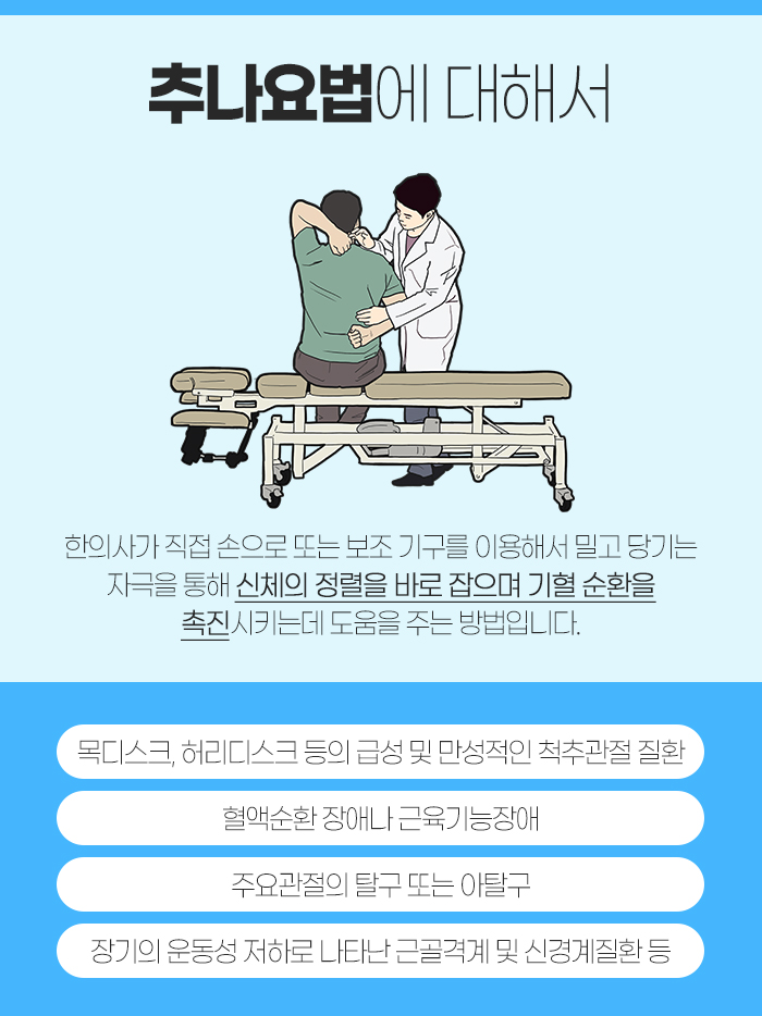 이는 추나요법이 한의사가 직접 손이나 보조기구로 밀고 당기는 자극을 통해 신체의 정렬을 바로 잡으면서 기혈 순환을 촉진시키는데 도움을 주기 때문입니다. 그래서 목디스크나 허리디스크 등의 급성 및 만성적인 척추 관절 질환을 앓고 있는 경우, 혈액순환장애나 근육기능장애가 발생한 경우, 장기의 운동성 저하로 나타난 근골격계 및 신경계질환을 앓고 있는 경우에도 도움을 받을 수 있는데요. 주요 관절의 탈구나 아탈구에도 도움을 받을 수 있답니다.