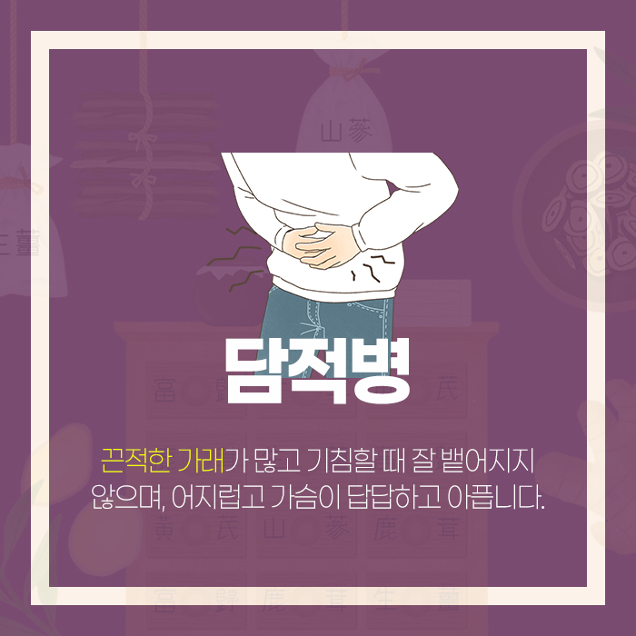 담적병은 구적 중 하나입니다. 담은 가래를 말하는데, 이 담이 가슴에 몰려 발생하게 됩니다. 끈적한 가래가 많아지면서 기침을 할 때 잘 뱉어지지 않은데요. 머리가 어지럽고 가슴이 답답하며 은근히 아프게 됩니다. 좀 더 자세히 말씀을 드려보자면