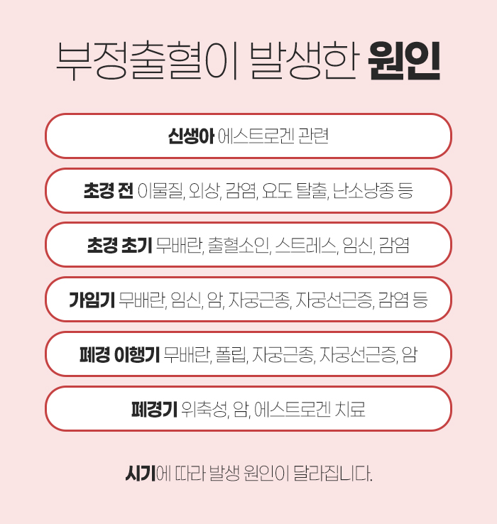 그리고 부정출혈이 발생하게 되는 원인은 다양한데요. 시기에 따라 발생 원인이 달라진답니다. 신생아 때거나 초경 전에도 나타날 수 있는데요. 신생아의 경우 에스트로겐과 관련이 있습니다. 또 초경 전에는 이물질이나 외상, 감염, 요도탈출, 난소낭종 등으로 인해 나타날 수 있습니다.