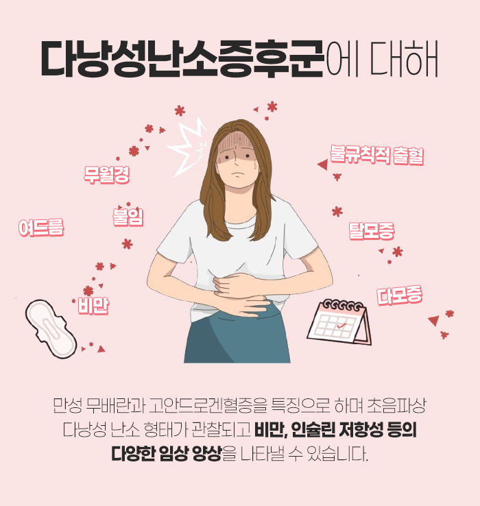 그리고 다낭성난소증후군으로 인해 부정출혈이 발생하게 되는 경우가 제법 많은데요. 그래서 이에 대해 말씀을 드려보자면 만성 무배란과 고안드로겐혈증을 특징으로 한답니다. 초음파를 이용해 살펴봤을 때 다낭성난소형태의 형태가 관찰됩니다. 그리고 비만이거나 인슐린 저항성 등의 여러 임상 증상이 나타날 수 있는데요. 이렇게 다낭성 난소 증후군을 앓게 되면 부정출혈과 무월경, 여드름, 불임, 비만, 탈모증, 당뇨증 등이 나타나게 됩니다.