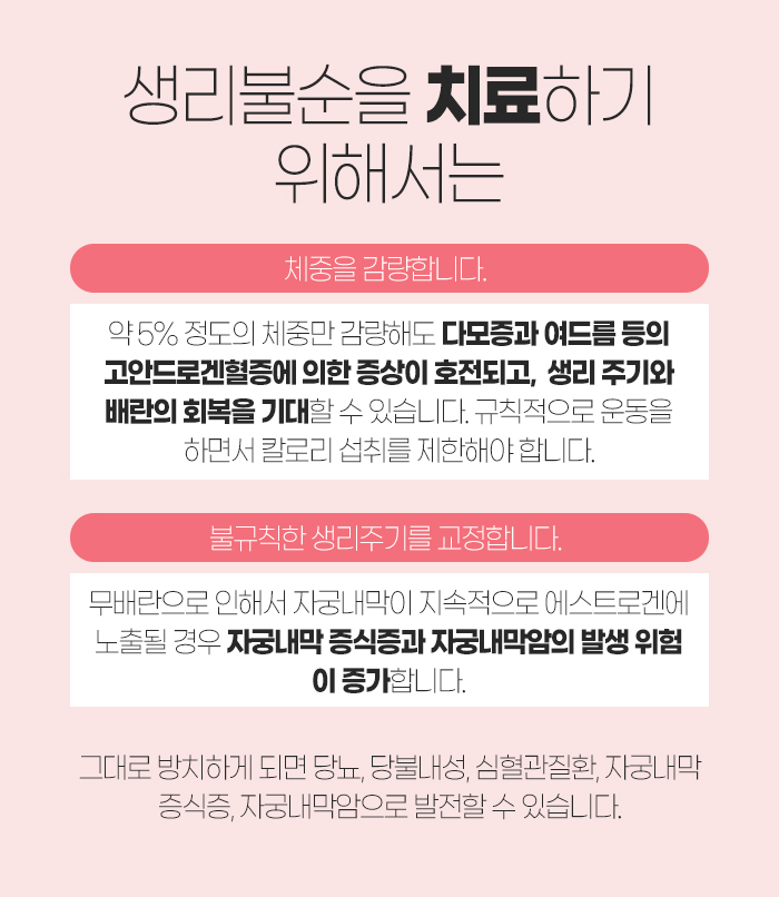 또 부정출혈은 꼭 교정하는 것이 좋습니다. 그 이유는 무배란인 경우 자궁내막이 지속적으로 에스트로겐에 노출되면서 자궁내막 증식증과 자궁내막암의 발생 위험이 증가하게 되기 때문입니다. 이대로 방치하게 될 경우 당뇨나 당분해성, 심혈관질환, 자궁내막 증식증, 자궁내막암으로 발전할 수 있답니다.