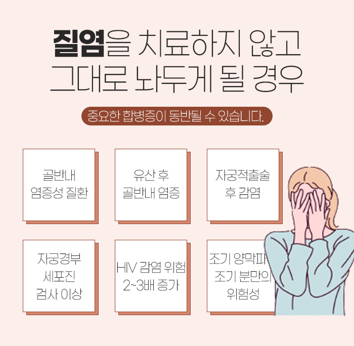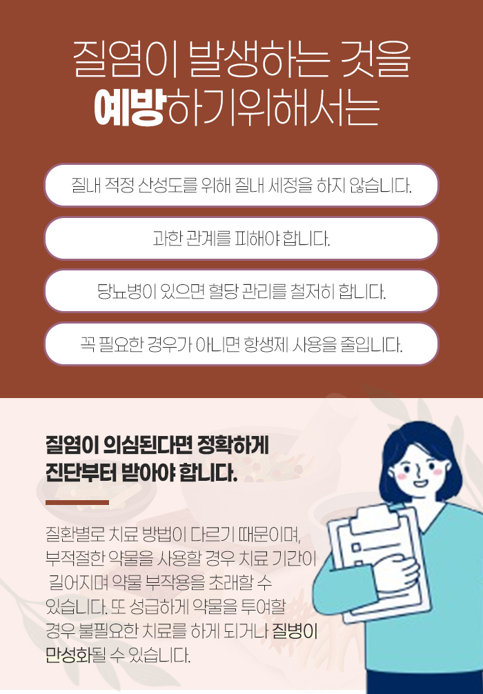이 외에도 질염이 의심된다면 정확하게 진단부터 받아야 한답니다. 그 이유는 아까 보신 것처럼 질염의 종류가 다양하고 그에 따라 적절한 치료 방법이 달라지게 되기 때문입니다. 이때 부적절한 방법을 사용하게 되면 치료 기간이 길어지게 되는데요. 또 불필요하게 치료를 하게 될 경우 오히려 만성화될 수 있습니다.