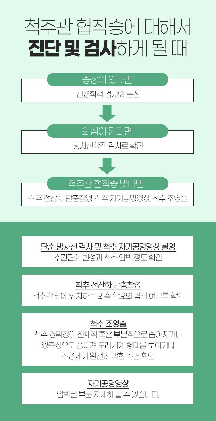 그리고 요통으로 인해 진단 및 검사를 하게 될 경우 다음과 같은데요. 요통이 있을 때 신경학적 검사와 문진을 하게 되고, 그 후 척추관 협착증이 의심된다면 방사하선학적 검사로 확진을 하게 됩니다. 그러고 나서 척추관 협착증이 맞는 경우 척추 전산화 단층촬영과 척추 자기공명영상, 척수 조영술을 진행하게 되는데요.