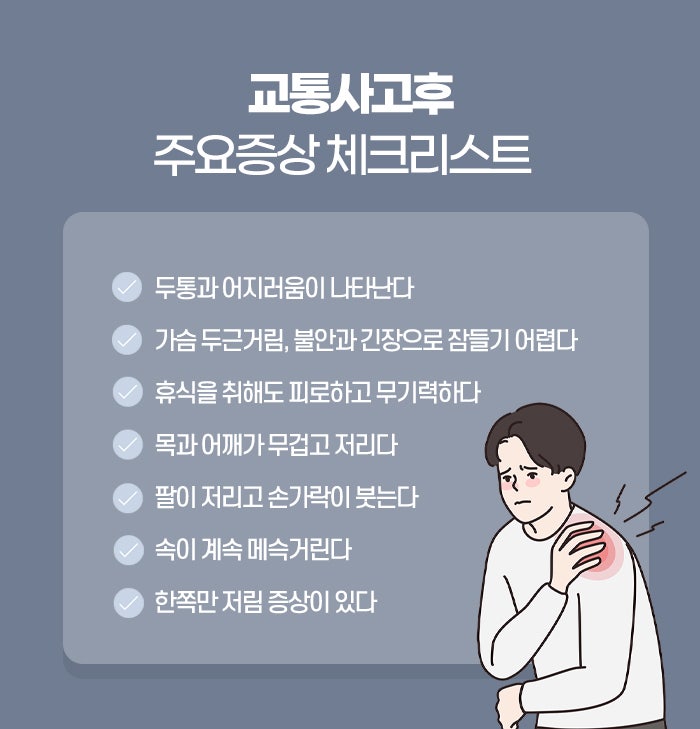 경직된 근육을 풀어주는 스트레칭, 관절 가동범위를 회복시키는 운동, 자세 교정, 심호흡과 명상 등을 통해 몸과 마음을 동시에 회복시키는 접근이 도움이 됩니다. 온찜질과 찜질팩, 가벼운 마사지도 혈류를 촉진하여 회복에 긍정적인 영향을 줄 수 있습니다. 교통사고라는 사건은 한순간에 우리의 일상을 뒤흔들 수 있는 큰 충격이지만, 그 이후의 삶은 충분히 회복되고 다시 안정될 수 있습니다. 아픔을 겪었다는 사실은 당신이 약하다는 것이 아니라, 그만큼 강한 충격을 견뎌냈다는 의미이며, 지금 이 순간에도 몸과 마음은 회복을 위해 쉼 없이 노력하고 있습니다. 혹시 아직 통증이나 불편함이 남아있 더라도 너무 조급해하지 마시고, 회복에는 시간이 필요하다는 사실을 기억해 주세요.