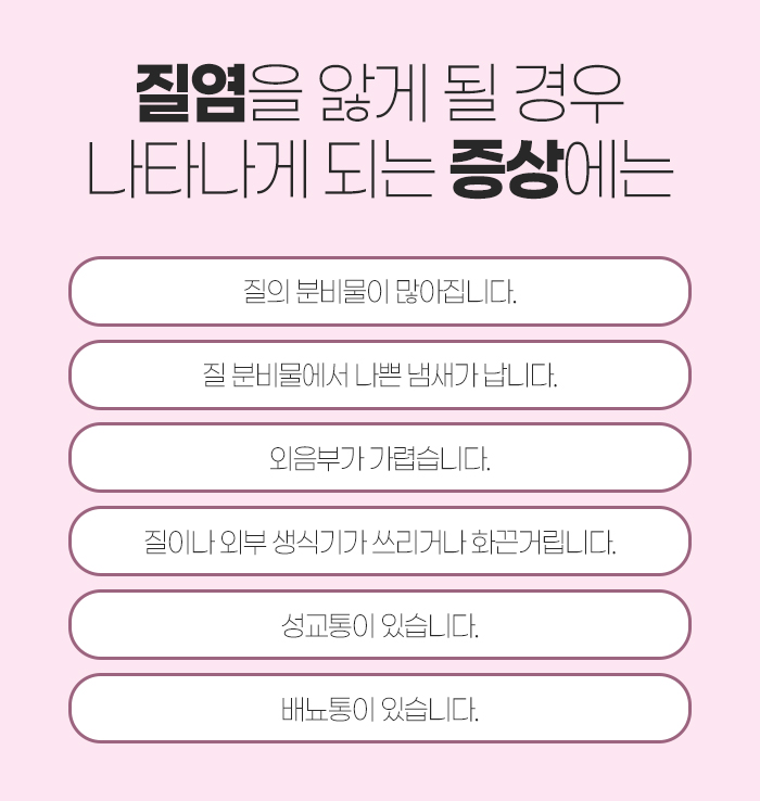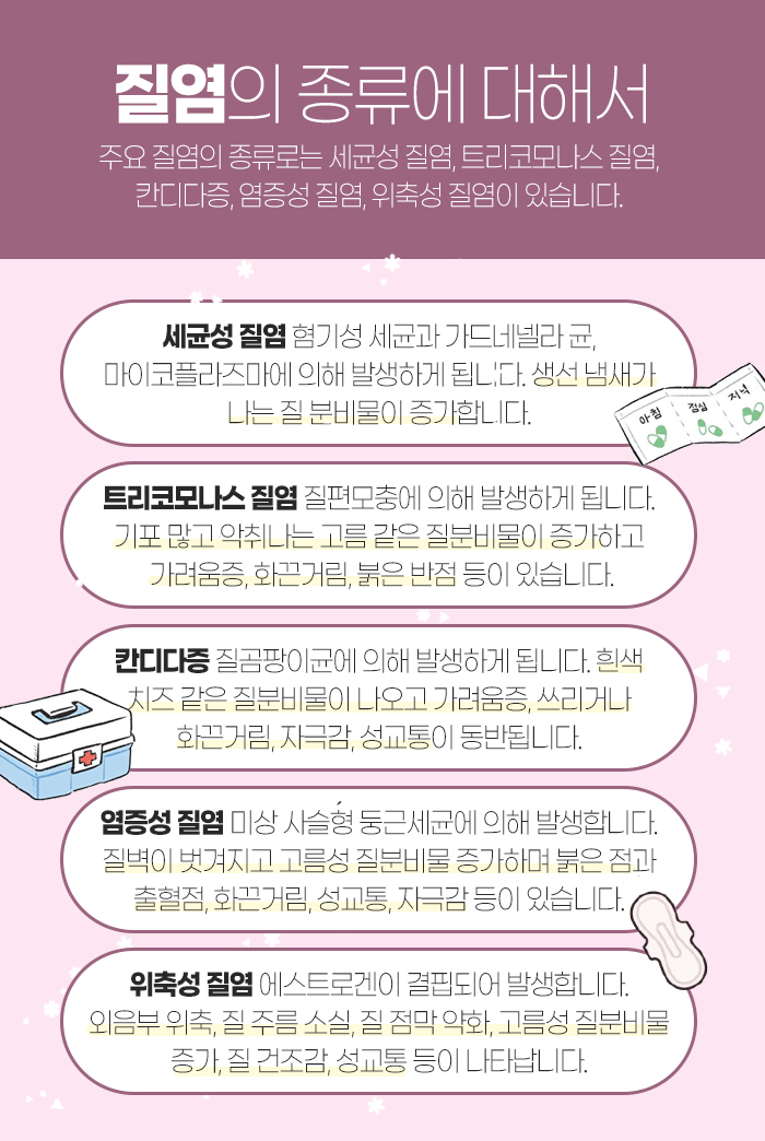 질염이란 질환에 대해 설명해보자면 바이러스나 세균, 곰팡이, 기생충 등으로 질에 염증이 생기면서 발생하게 된답니다. 앓게 되면 다음과 같은 증상이 나타나게 되는데요.