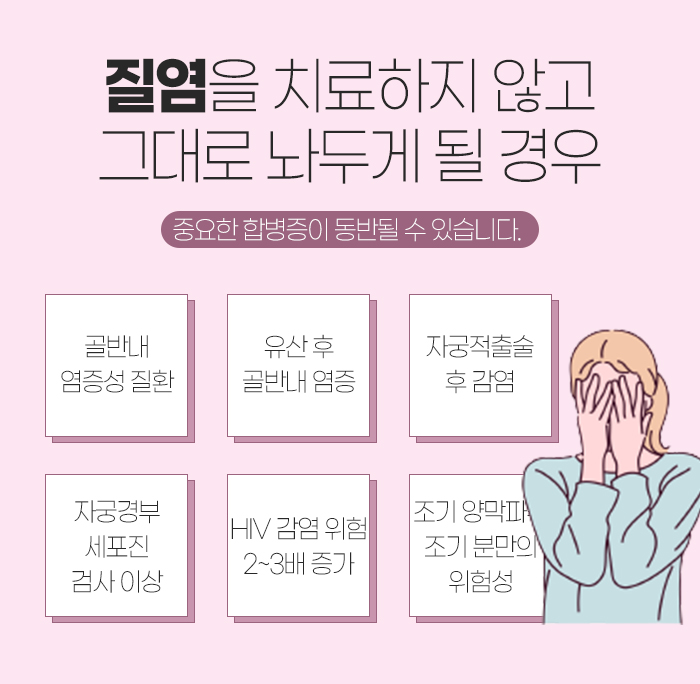 골반 내 염증성 질환이 생기거나 유산 후 골반 내 염증 등이 생길 수 있고, HIV 감염 위험도 2~3배 증가합니다. 또 조기 분만의 위험성이 높아지는 등의 문제가 있는데요. 그렇기에 잘 낫지 않는다 해도, 자주 재발한다고 해도 꼭 치료를 하는데 도움을 받도록 해야 합니다.
