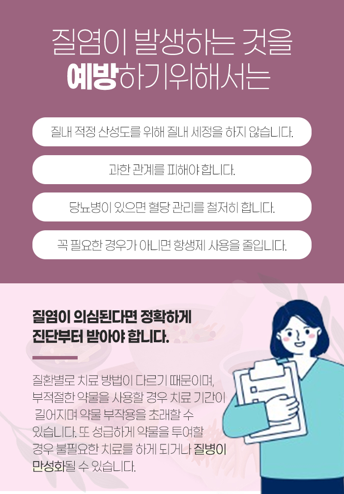 우선 내부를 세정하지 않는 것이 좋습니다. 이는 적정 산성도를 유지하기 위함입니다. 또 관계를 과하게 하는 것은 좋지 않습니다. 그리고 당뇨병이 있는 경우에는 혈당관리를 철저히 하도록 해야 하는데요. 이는 당뇨병이 칸디다증의 위험 인자일 수 있기 때문입니다. 또 반드시 필요한 경우가 아니라면 항생제를 사용하는 것을 줄이는 게 좋습니다.