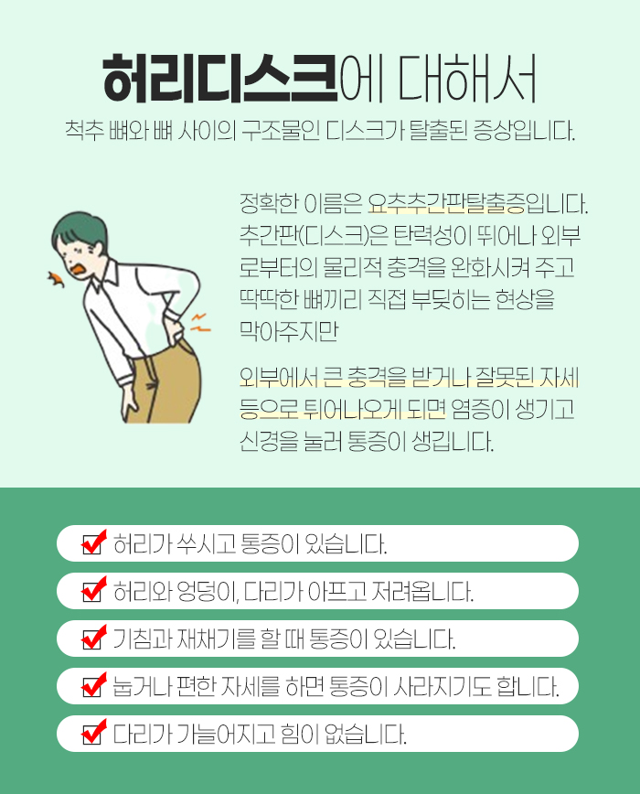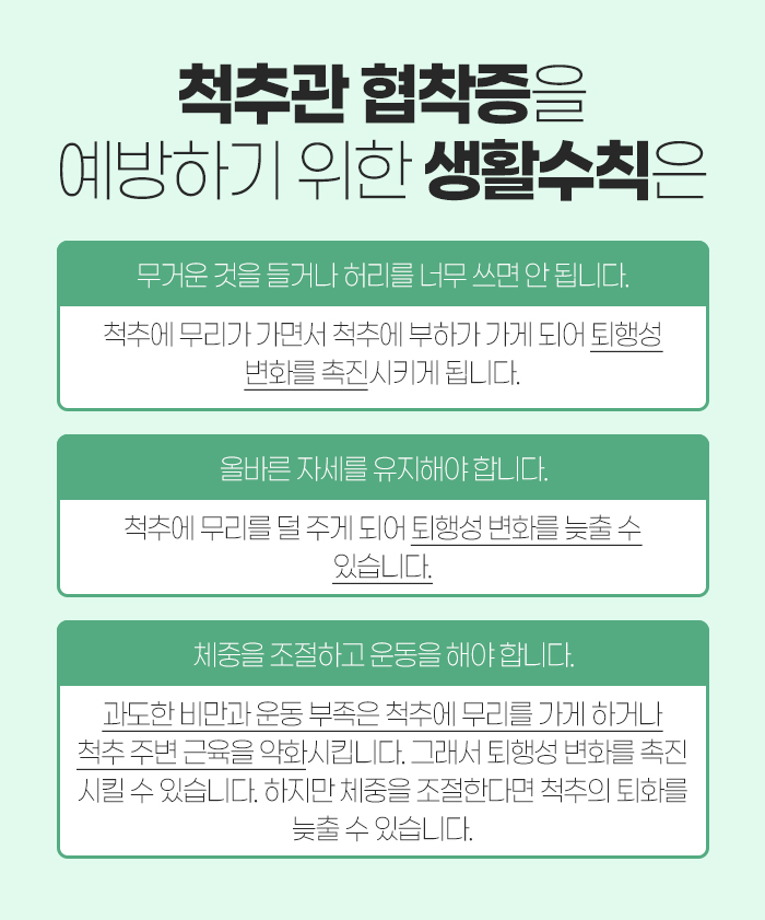 이러한 생활 수칙에 대해 말해보자면 무거운 물건을 들거나 허리를 너무 쓰면 안 된답니다. 그 이유는 척추에 무리가 가게 되면서 척추에 부하가 가게 되어 퇴행성 변화를 촉진시키게 되기 때문입니다.