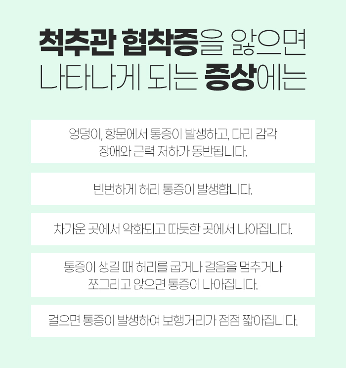 그리고 척추관협착증을 앓게 되면 다음과 같은 증상이 나타나게 되는데요.