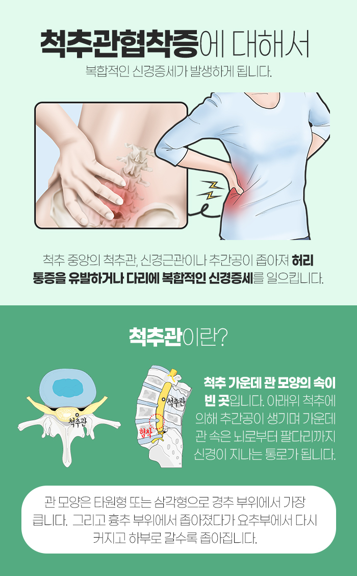 그리고 척추관 협착증에 대해 말해보자면 척추 중앙의 척추관, 신경근관이나 추간공이 좁아지게 되면서 허리에서 통증이 발생하게 되거나 다리에 복합적인 신경 증세를 일으키게 되는 질환을 말합니다.
