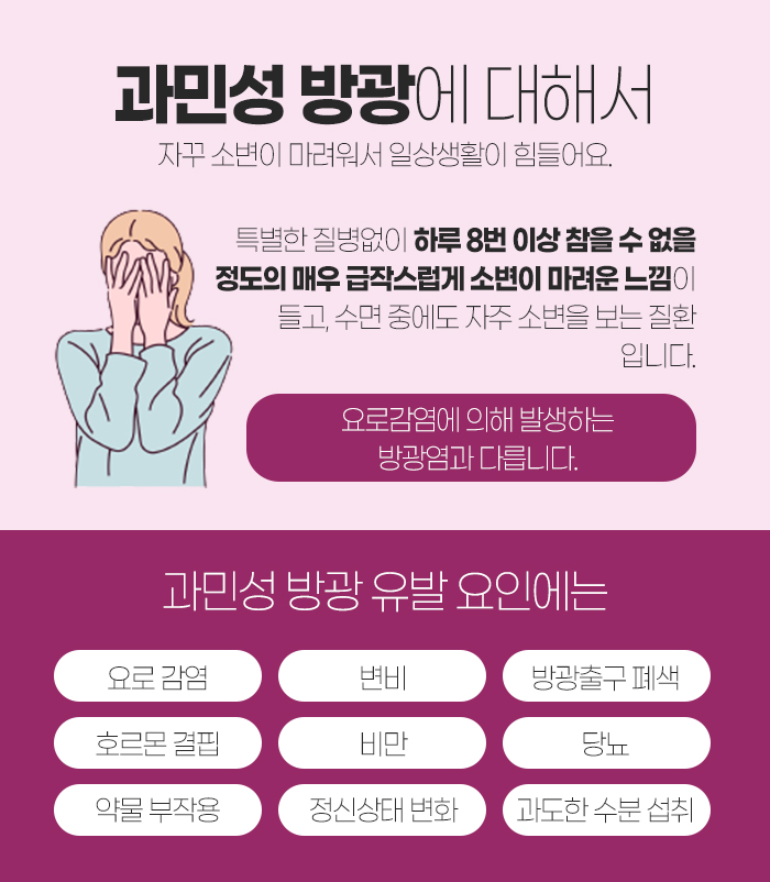 또 과민성 방광이 유발하게 되는 요인에 대해 말해보자면 호르몬 결핍과 약물 부작용, 변비, 비만, 정신 상태 변화, 요로감염, 방광출구 폐색, 당뇨, 과도한 수분 섭취가 있답니다.