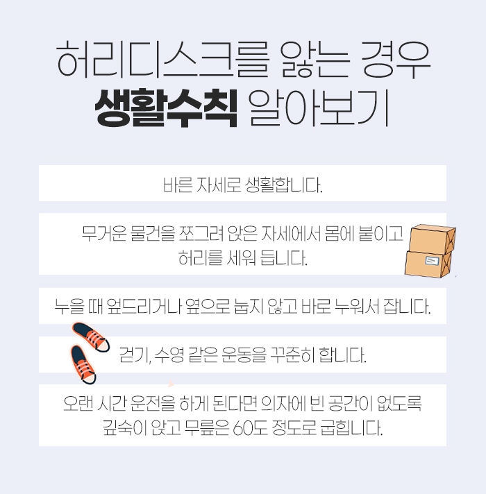 특히 허리와 복부 근육이 약하진 경우 평소 운동량이 부족한 경우가 많은데요. 이런 경우에는 무리하지 않게 운동을 해주는 것이 중요합니다. 또 바른 자세를 취하는 것이 중요한데요. 허리 건강에도 좋지 않지만 이 외에도 목 건강이나 어깨 건강 등 전체적으로 악영향을 끼치게 된답니다.