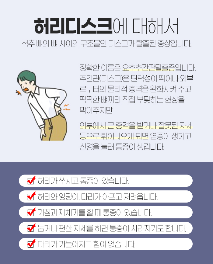 우선 허리디스크란 질환에 대해 알아보자면 척추뼈와 뼈 사이에 있는 구조물인 디스크가 탈출되면서 나타나게 되는 증상입니다. 정확한 이름은 요추 추간판 탈출증이라고 하는데, 추간판은 탄력성이 뛰어나 외부로부터 물리적 충격을 완화시켜주고 딱딱한 뼈끼리 직접 부딪히는 현상을 막아줍니다.