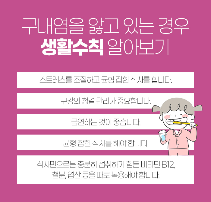 또 구강 청결 관리가 중요하며 금연을 하는 것이 좋은데요. 특히 흡연은 구내염을 비롯해 모든 질환에 좋지 않습니다. 또 식사만으로 비타민 B12나 철분, 엽산 등은 충분히 섭취하기 힘든 만큼 따로 복용하는 게 좋답니다.