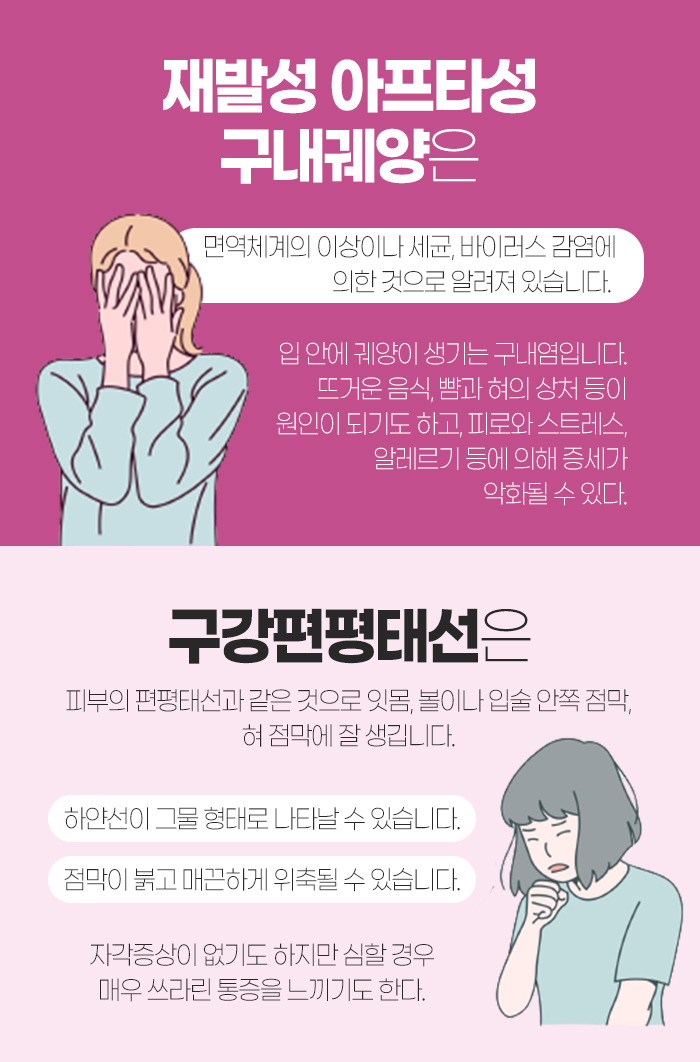 또 재발성 아프타성 구내궤양은 면역체계의 이상이나 세균, 바이러스 감염 때문에 나타나는 것으로 알려져 있습니다. 입안에 궤양이 생기게 되는데 뜨거운 음식을 먹거나 뺨과 혀의 상처 등의 원인이 되기도 합니다. 또 너무 피로하거나 스트레스를 받은 경우, 알레르기 등에 의해서 증상이 악화되기도 한답니다.