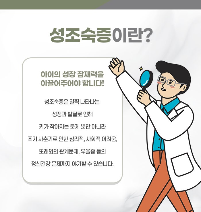 사춘기가 너무 일찍 시작되면 성호르몬이 빠르게 분비되어 성장판이 빨리 닫히게 됩니다. 특히 여아의 경우 초등학교 저학년 이전에 유방 발달이 시작되거나, 남아에서 음모나 음경 발달이 일찍 나타나는 경우 조기 사춘기를 의심해야 합니다. 이런 경우 키가 빨리 자라는 듯하지만, 결국 성장판이 빨리 닫혀 최종 키가 작게 됩니다. 조기 사춘기는 비만, 환경호르몬, 유전적 요인 등과 관련이 있습니다. 성장 부진을 방치하면 단순히 키가 작아지는 문제를 넘어서, 신체적·정신적 건강 전반에 영향을 미칩니다. 성장 부진은 아이의 자신감과 사회성에도 영향을 미치며, 또래 관계에서 위축감을 느낄 수 있습니다. 또한 영양 결핍이나 호르몬 불균형이 장기간 지속되면 면역력이 떨어지고, 피로감, 집중력 저하, 학습능력 저하로 이어질 수 있습니다. 사춘기 발달이 늦어지거나 생리 불순, 체형 불균형이 생기기도 하며, 성인 이후 골밀도가 낮아져 골다공증 위험이 커질 수도 있습니다. 따라서 성장 부진은 단순한 키의 문제가 아니라, 아이의 전반적인 건강을 반영하는 신호로 보아야 한다고 원주성장한약 한의원에서는 말합니다.