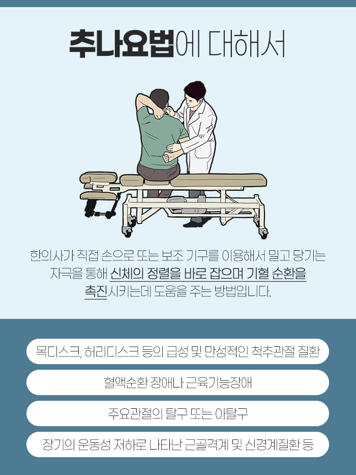 그래서 목디스크나 허리디스크 같은 급성 및 만성적인 척추 관절 질환을 앓고 있을 때 도움을 받으시는 경우가 많습니다. 또 혈액순환장애가 있거나 근육기능장애가 있는 경우, 주요관절에 탈구나 아탈구가 발생한 경우, 장기의 운동성 저하로 인해서 근골격계나 신경계질환이 나타난 경우에도 찾으시는데요.