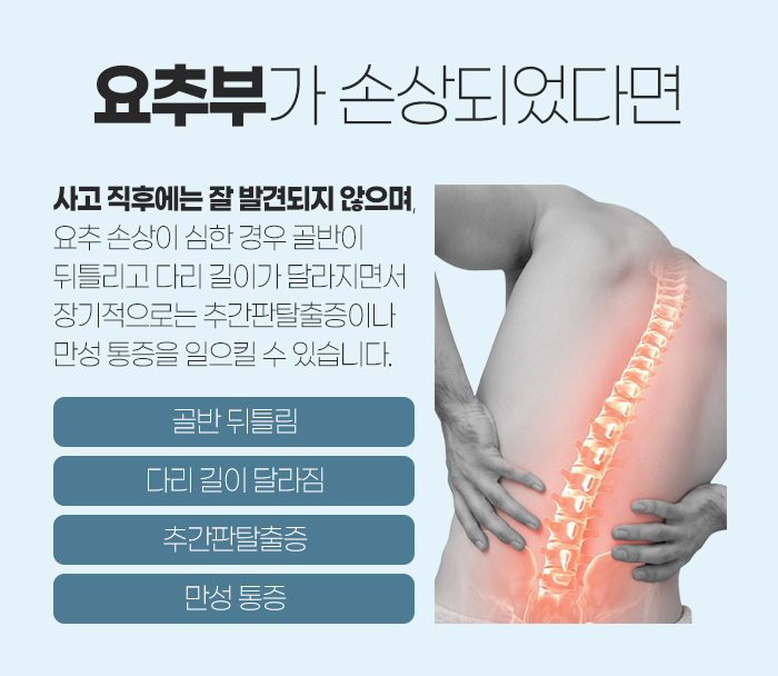 그도 그럴 것이 우리의 몸이 사고를 당했을 때 충격으로부터 몸을 보호하고자 경직되기 때문입니다. 그래서 시간이 지나고 난 후 서서히 통증이 나타나게 되는 것인데요. 이렇게 요추부가 손상되는 경우 만성적으로 통증이 나타날 수 있고 추간판탈출증이 발생할 수 있습니다. 또 심하면 골반이 뒤틀리거나 다리 길이가 달라질 수 있답니다. 이렇게 골반이 뒤틀리고 다리 길이가 달라진 경우 추나요법 등의 방법을 통해 도움을 받게 된답니다.