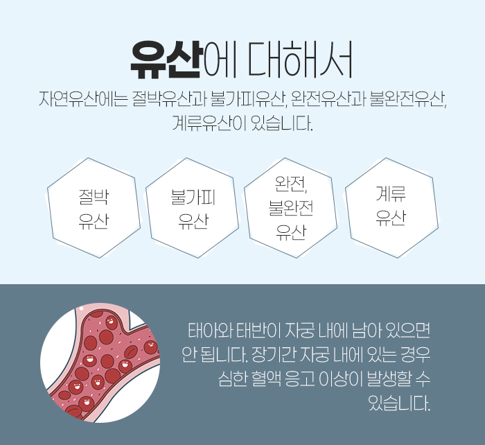 이처럼 유산을 했을 때 중요한 것은 태아와 태반이 자궁 내에 남아 있지 않는 것입니다. 장기간 자궁 내에 남아 있게 되면 심한 혈액 응고 이상 등이 나타날 수 있기 때문입니다.