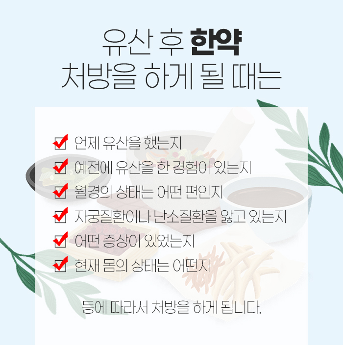 하지만 고려해야 할 점들이 많습니다. 무작정 몸에 좋다는 약재로 한약을 제조하여 처방할 것이 아니라 환자분 개개인에 맞게 제조하고 처방해야 하는데요. 이를 위해 무실동야간진료한의원 등에서는 유산을 한 시기와 유산 경험, 월경 상태, 앓고 있는 자궁 질환 및 난소 질환 유무, 증상, 현재 몸의 상태 등을 진단하고 있답니다.