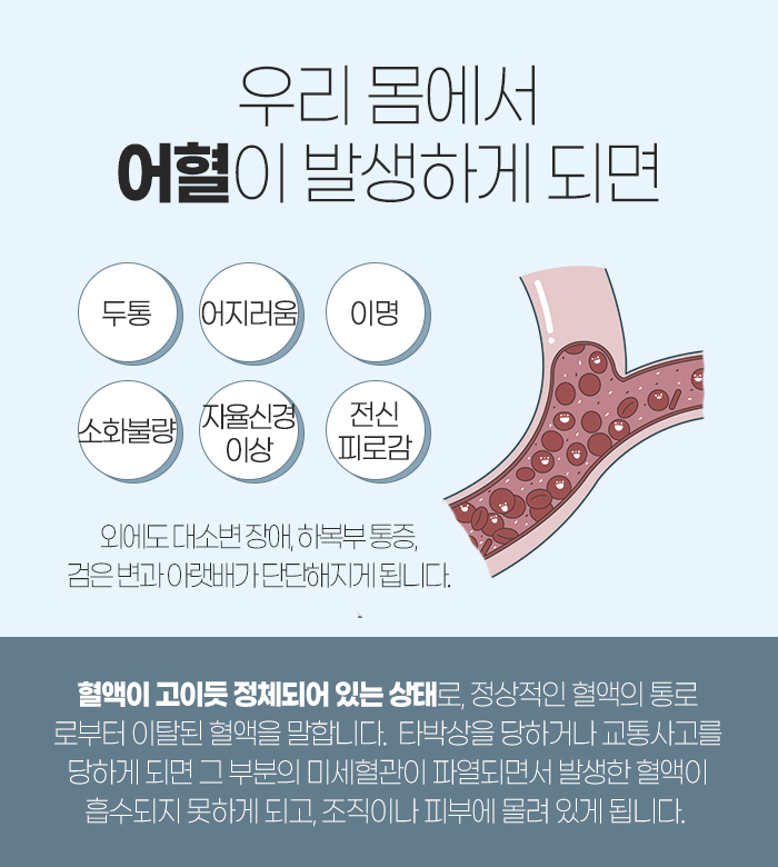또 어혈 역시 발생하게 되는데요. 어혈이란 혈액이 고이듯 정체되어 있는 상태입니다. 정상적인 혈액의 통로로부터 이탈된 혈액을 말하는데요. 보통 타박상을 당하거나 교통사고를 당했을 때 발생하게 됩니다. 이는 미세혈관이 파열되면서 발생한 혈액이 흡수되지 못한 채 조직이나 피부에 몰려 있게 되어서인데요.