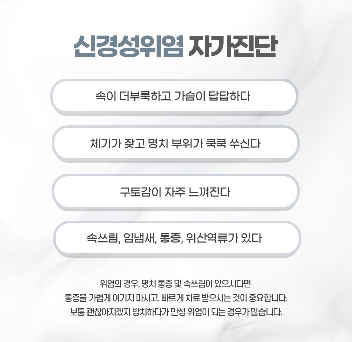 신경성위염은 단순히 위의 질환이 아니라 마음이 보내는 신호입니다. 몸이 아프다는 것은 단지 신체의 문제만이 아니라, 마음이 너무 지쳐서 쉬어야 한다는 뜻이기도 합니다. 그동안 쌓인 스트레스와 긴장, 걱정이 위를 통해 표현된 것일 수 있습니다. 그러니 자신을 탓하거나 조급해하지 말고, 잠시 멈춰서 몸과 마음을 돌보는 시간을 가지는 것이 필요합니다. 따뜻한 식사 한 끼, 깊은 숨 한 번, 자신에게 건네는 작은 위로가 회복의 시작이 될 수 있습니다. 신경성위염은 충분히 회복 가능한 질환이며, 스스로를 아끼고 관리할수록 회복 속도는 빨라집니다.