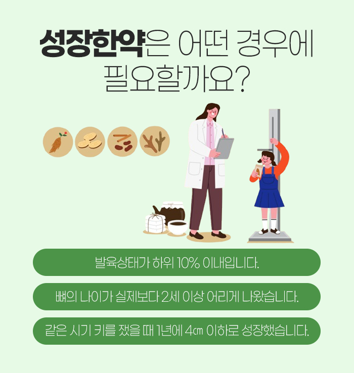 그보다는 아이의 체질과 나이, 건강 상태 등에 따라 성장 정도를 파악하여 제조하도록 해야 합니다. 또 아이의 허약한 부분과 넘치는 부분에 대해서도 파악해야 하는데, 그래야 각 기능을 보강할 수 있는 한약을 처방할 수 있기 때문입니다.