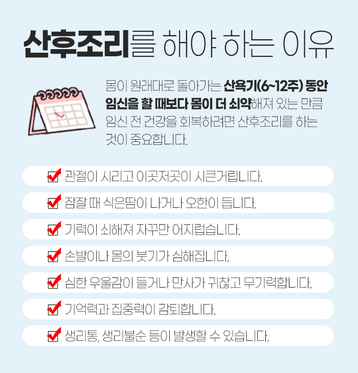 산후 조리를 해야 하는 이유는 무엇일까요? 몸이 원래대로 돌아가는 산욕기 동안 임신을 할 때보다 몸이 더 쇠약해져 있는 상태이기 때문입니다. 그래서 임신 전 건강을 회복하기 위해서는 산후조리를 하는 것이 무척 중요합니다.