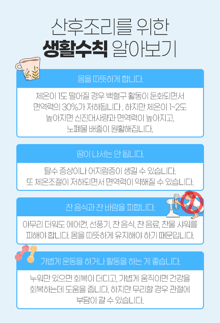 또 그렇다고 땀이 나서는 안 되는데요. 땀이 나게 되면 탈수 증상이나 어지럼증이 생길 수 있습니다. 그리고 체온 조절이 저하되면서 면역력이 약해질 수 있답니다. 이 외에도 찬 바람과 찬 음식을 피해야 하는 것 등이 있습니다.