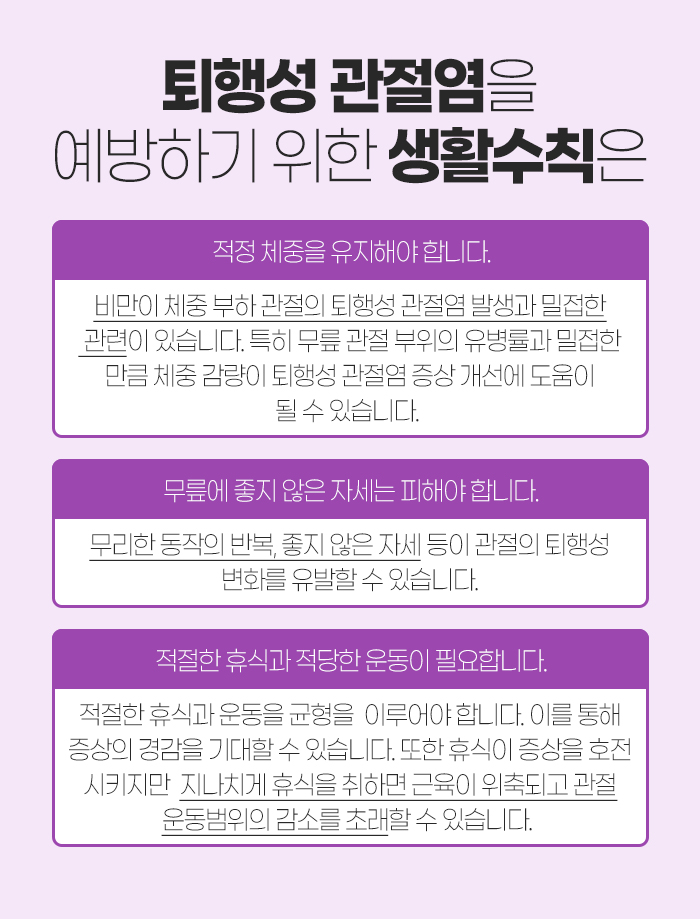 그리고 퇴행성 관절염을 앓게 되었을 때 무실동공휴일한의원 등에서 도움을 받는 것도 좋지만 다음과 같은 상황은 지켜주시는 게 좋은데요. 우선 적정 체중을 유지해야 한답니다. 비만이 되면 체중의 부하로 인해 관절에 무리가 가기 때문인데요. 특히 무릎 관절 부위의 유병률과 밀접한 관련이 있는 만큼 체중을 감량하는 것이 증상을 개선하는데 도움을 줄 수 있습니다.