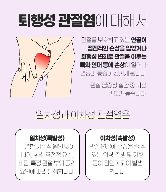 이러한 퇴행성 관절염은 일차성과 이차성이 있답니다. 일차성은 특별한 기질적 원인 없이 나이나 성별, 유전적인 요소, 비만, 특정 관절 부위 등의 요인에 따라 생길 수 있습니다. 이차성은 관절 연골에 손상을 줄 수 있는 외상이나 질병 및 기형 등의 원인이 되어 생길 수 있습니다.