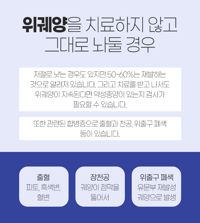 그리고 혹시라도 위궤양이 발생했을 때 방치하지 말아야 하는데요. 물론 불편하고 고통스러워 방치하기도 힘들지만 방치를 하게 되면 다양한 합병증이 나타날 수 있기 때문입니다. 출혈이나 천공, 위출구 폐색, 피토, 흑색변, 혈변, 장천공이 나타날 수 있어서인데요. 참고로 장천공은 궤양이 점막이 뚫는 것을 말하며, 위출구 폐색은 유문부 재발성 궤양으로 발생하게 되는 것을 말합니다.