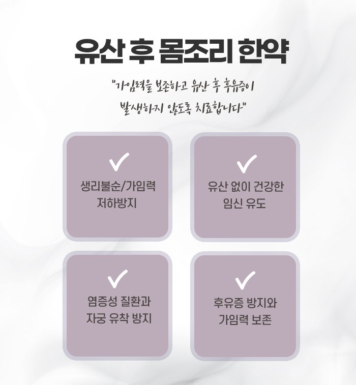 또한 출혈이 지속되거나 통증이 계속되면 체력과 면역력이 떨어지고 정신적으로도 깊은 슬픔과 불안, 죄책감, 두려움이 장기간 이어질 수 있어 정서적인 관리 역시 매우 중요합니다. 그렇기 때문에 유산 후에는 몸의 회복뿐 아니라 마음을 돌보는 것도 중요하며 스스로를 탓하거나 서두르기보다 내 몸의 균형을 되찾는 과정으로 바라보는 태도가 필요합니다. 유산 후 한약이 어떻게 도움이 되는지 궁금해하시는 분들이 많습니다. 원주유산후한약은 몸의 기운을 보충하고 혈의 흐름을 다스리며 몸이 스스로 균형을 회복하도록 돕는 데 목적을 둡니다. 유산을 경험한 후에는 자궁 점막이 약해지거나 혈의 흐름이 제대로 순환되지 않아 냉감, 피로감, 두통, 생리불순, 아랫배 묵직함 같은 증상이 이어지기도 합니다.