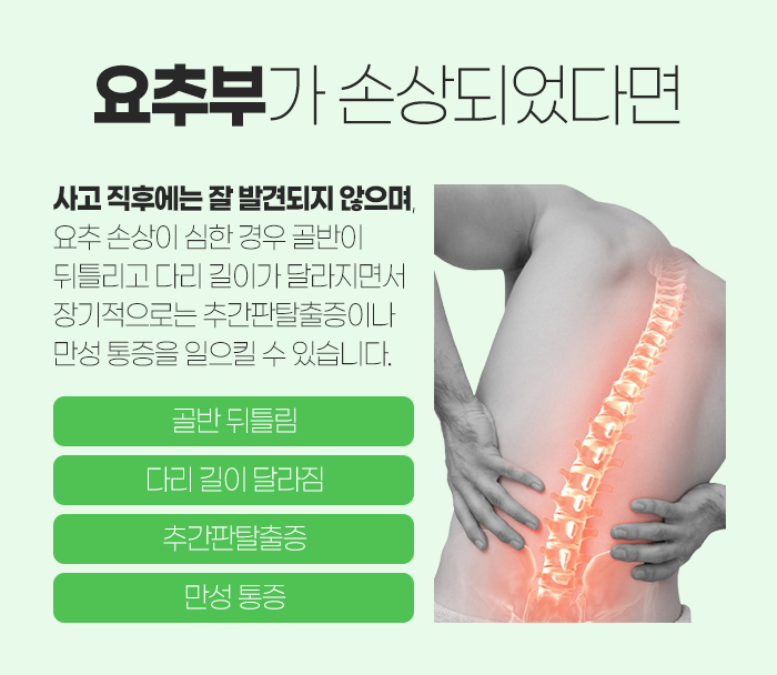 그 이유는 우리의 몸이 충격으로부터 몸을 보호하고자 경직이 되기 때문입니다. 그래서 시간이 지나 경직이 풀리면서 뒤늦게 통증이 나타나는 경우가 많은데요. 이러한 요추부 손상은 심한 경우 골반이 뒤틀리고 다리 길이가 달라지게 된답니다.