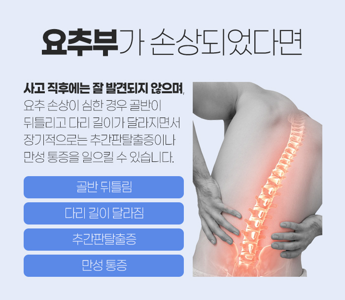 이 중 심한 외상으로 허리디스크가 발생하여 무실동공휴일한의원을 찾아주신 분들을 보면 보통 사고 직후보다 좀 시간이 지나고 나서 찾아주시게 되는 경우가 많습니다. 그 이유는 몸이 충격을 받게 될 때 몸을 보호하기 위해 경직되기 때문인데요. 그래서 직후 바로 통증과 같은 증상이 나타나는 것이 아니라 뒤늦게 나타나게 되는 경우가 많답니다.