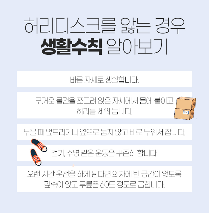 또 누울 때는 엎드리거나 옆으로 눕지 않고 바로 누워서 자도록 해야 하는데요. 걷기나 수영 같은 운동도 꾸준히 하는 것이 좋고, 운전을 오랜 시간 동안 하게 된다면 의자에 빈 공간이 생기지 않게 깊숙이 앉으면서 무릎을 60도 정도로 굽혀야 한답니다.