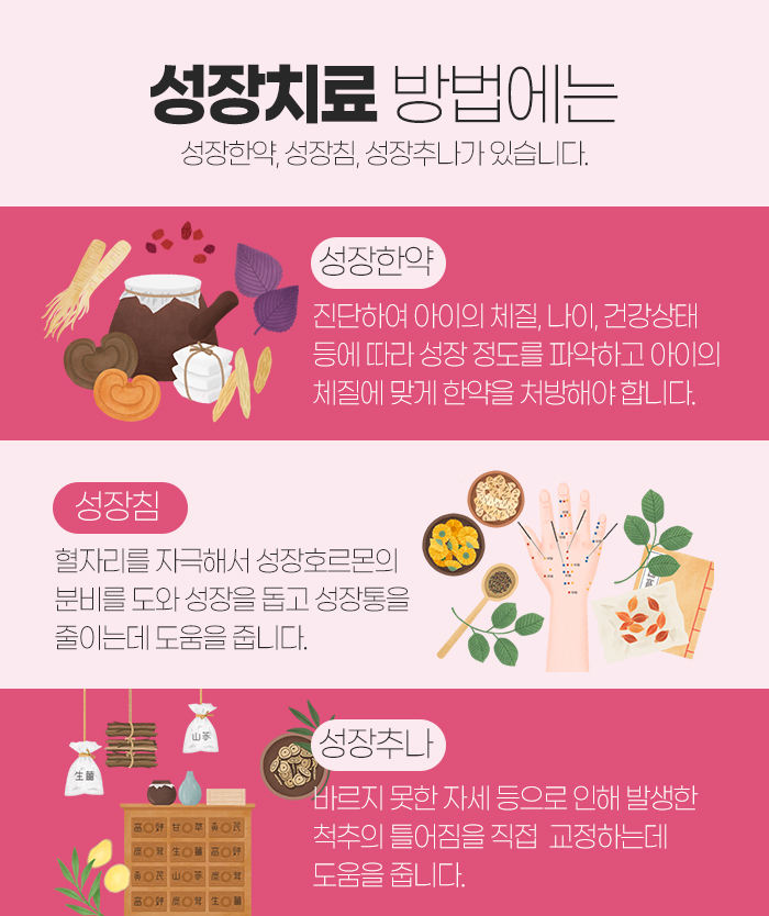 그리고 키 성장이 부진한 이유는 다양한데요. 타고나길 허약한 체질이어서 성장이 더딘 경우도 있고, 비염이나 알레르기 같은 호흡기 질환을 앓고 있어서 성장이 더딘 경우도 있습니다. 또 심신이 미약한 편이거나 밤에 자주 깨서, 잔병치레가 잦아서, 비위가 약하고 소화기능이 좋지 않아서, 먹는 양 자체가 너무 적거나 편식을 많이 해서인 경우도 있는데요. 이런 경우 건강에 악영향을 주게 되면서 성장에도 좋지 않답니다.