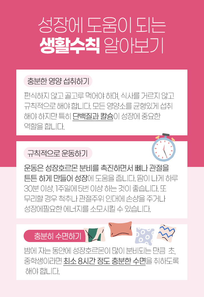 또한 수면 역시 중요한데요. 수면을 취하는 동안 성장호르몬이 많이 분비되기 때문입니다. 더욱이 성장기인 초등학생과 중학생의 경우에는 최소 8시간 정도는 충분히 수면을 취해주도록 해야 합니다.