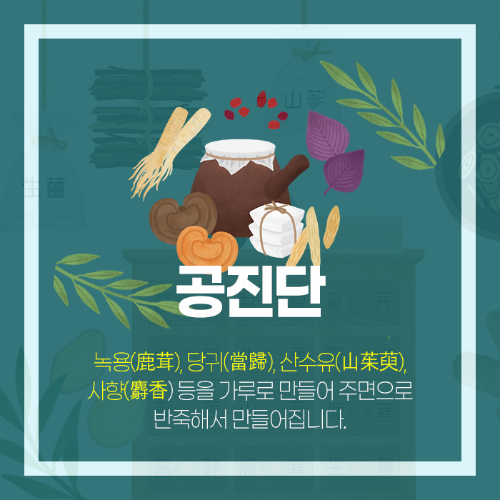 또 공진단이 신체의 퇴행성 변화에 도움을 줄 수 있는 이유는 중추 신경계의 손상을 회복시키면서 신경 보호와 기억력을 증진하는 등의 효과를 가지고 있고 혈압, 고지혈증 같은 대사성 질환을 완화하며 생식 능력을 증진시키는 등에 활용되었다는 연구가 있기 때문입니다.