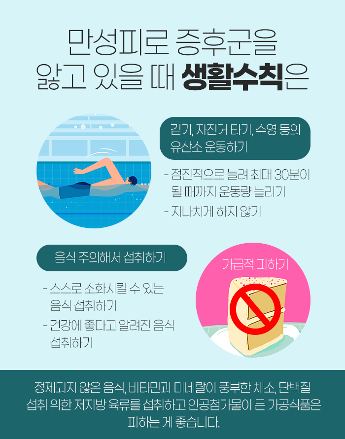 운동에 대해 말해보자면 걷기와 자전거 타기, 수영 등의 운동을 해주는 것이 좋고, 이를 점진적으로 늘려서 최대 30분이 될 때까지 해주어야 한답니다. 물론 안 그래도 피로한데 무슨 운동이냐고 생각하실 수 있지만 오히려 운동을 하지 않고 계속 휴식을 취하는 것이 몸에 더 좋지 않답니다.